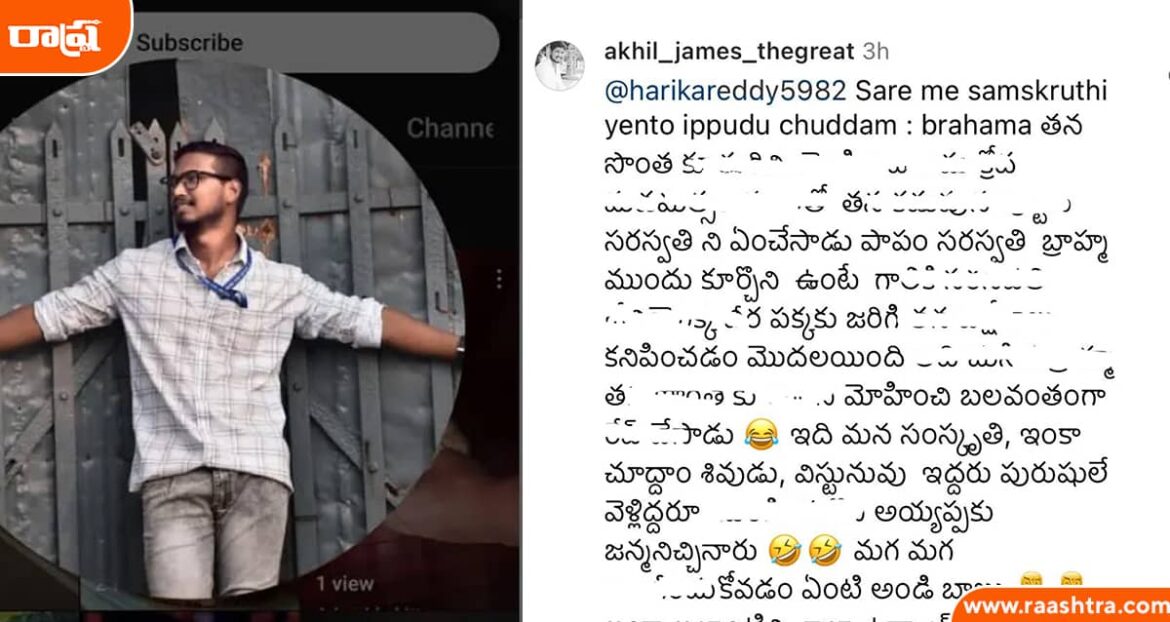 ‘అఖిల్ జేమ్స్ ది గ్రేట్’ పేరుతో ఉన్న ఇతడి ట్విట్టర్ అకౌంట్, యూట్యూబ్ ఛానల్ ఆధారంగా.. ట్రూ కాలర్ లో నెంబర్ సెర్చ్ చేసి చూస్తే ఏనుగుల అఖిల్.. ఊరు పార్వతీపురం అని చూపిస్తోంది. ఇతనికి ‘రాష్ట్ర’ కూడా ఫోన్ చేసింది. కానీ, లిఫ్ట్ చేయలేదు. ఇతర మతాల గురించి చిన్న మాట అంటే చాలు.. నానా రచ్చ చేసే నాయకులు, పోలీసులు.. హిందూ దేవుళ్లపై ఇలా ఏదిబడితే అది మాట్లాడుతూ.. చరిత్రను వక్రీకరిస్తున్నా పట్టించుకోవడం లేదని మండిపడుతున్నారు హిందువులు.