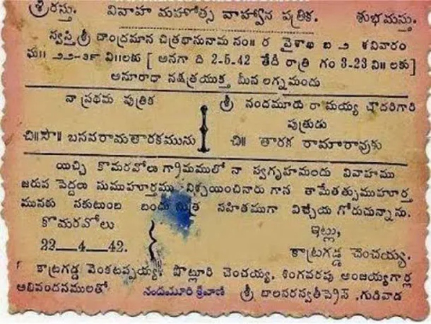 హిందూ సంప్రదాయం ప్రకారం పెళ్లి చేస్తే పెద్ద పండగలానే ఉంటుంది పెళ్లి అంటే ముందు మనకి గుర్తు వచ్చేది లగ్నపత్రిక. లగ్నపత్రిక చాలా ముఖ్యమైనది టెక్నాలజీ ఎంత పెరుగుతున్నా కూడా పెళ్లి శుభలేఖల్ని ప్రతి ఒక్కరు కూడా ప్రింట్ చేయించుకుని పంచి పెడుతున్నారు. అప్పట్లో లగ్నపత్రికలు కొంచెం సాదాసీదాగా ఉండేవి కానీ ఇప్పుడు వెరైటీ డిజైన్లు కూడా ఉంటున్నాయి. తారక రామారావు బసవతారకాన్ని పెళ్లి చేసుకునే సమయంలో ముద్రించిన పెళ్లి పత్రికని మీరు చూశారా..?